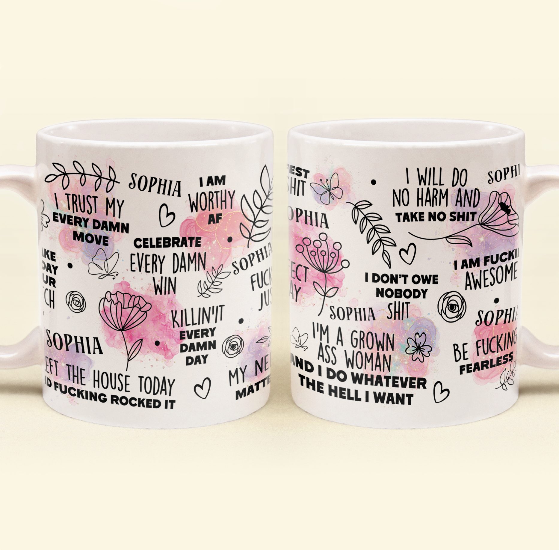 This customizable mug is a bold statement piece for anyone looking to affirm their self-worth. Featuring a playful mix of empowering phrases like “I am fucking perfect just the way I am,” “Manifest that shit,” and “My needs matter,” it serves as a daily reminder of self-love and confidence. The soft pink watercolor background adds a touch of elegance, balancing the strong words with a more delicate, artistic feel. The design includes various botanical elements and butterflies, making it visually appealing and unique. You can personalize this mug by adding your name, making it even more special. Perfect for gifting or treating yourself, it’s an ideal companion for your morning coffee or tea. Whether at home or the office, this mug will boost your mood and help you start your day with a positive mindset.
