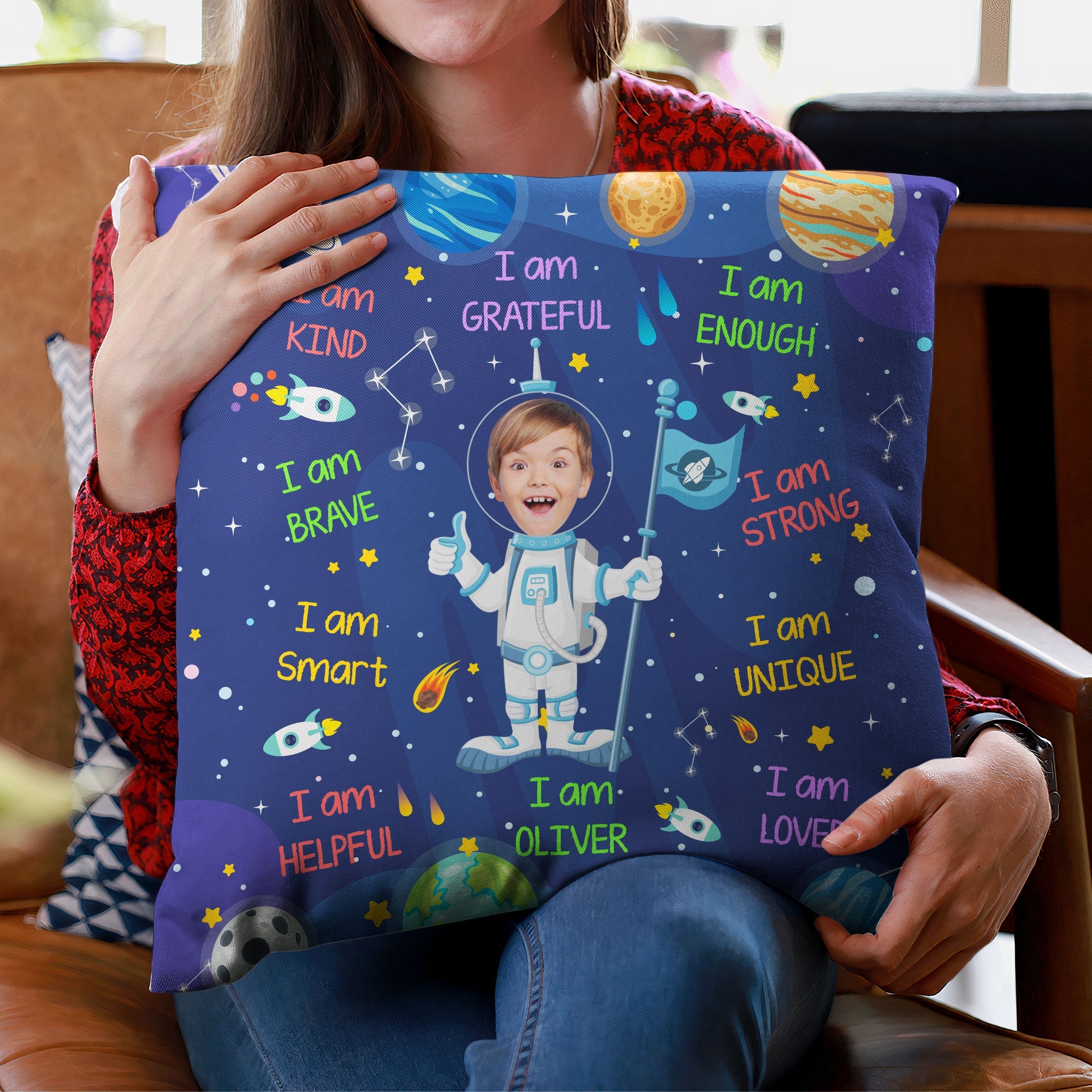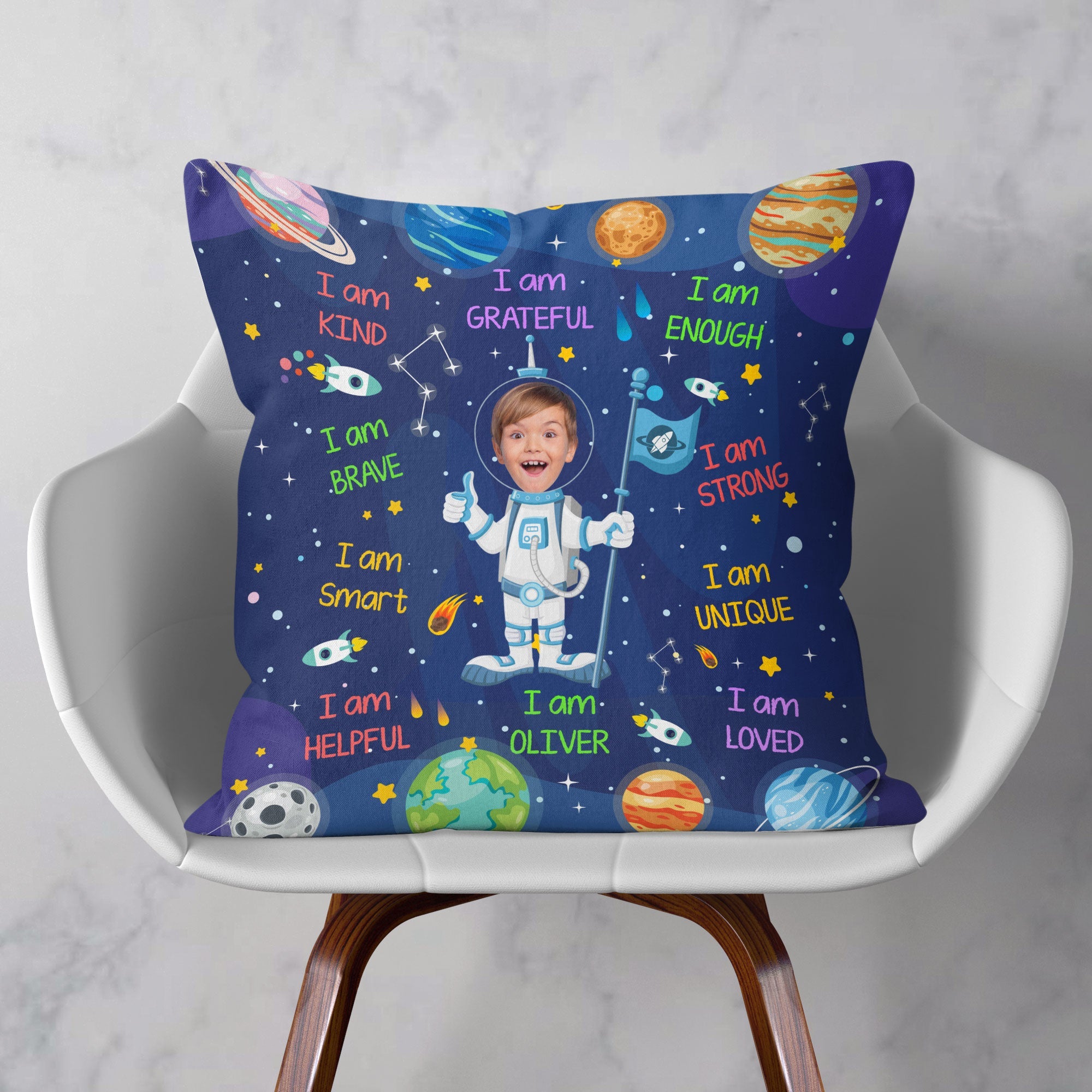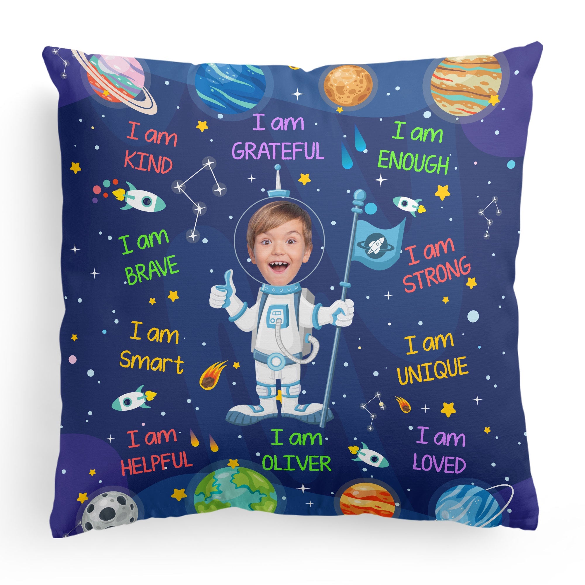 Introducing our Kid Affirmations “I Am Kind, Smart, Loved” Personalized Photo Pillow – a cozy and custom gift for your child. Featuring their name and a charming astronaut design, this pillow not only provides comfort but also fosters a positive environment. Celebrate special moments with this unique and thoughtful gift, perfect for birthdays, Christmas, or any occasion. The personalized touch makes it a cherished keepsake that will be treasured for years to come. Whether placed on their bed or in a cozy reading nook, this Kid Affirmations Photo Pillow is a wonderful addition to your child’s room or nursery decor. Add a touch of warmth and positivity to your child’s room with our Kid Affirmations Photo Pillow – a perfect blend of comfort and personalized charm. Customized with their name and adorned with affirmations, this personalized photo pillow is a heartwarming gift that not only brings physical comfort but also fosters a nurturing environment for your son, daughter, baby girl, baby boy, grandson, or granddaughter.