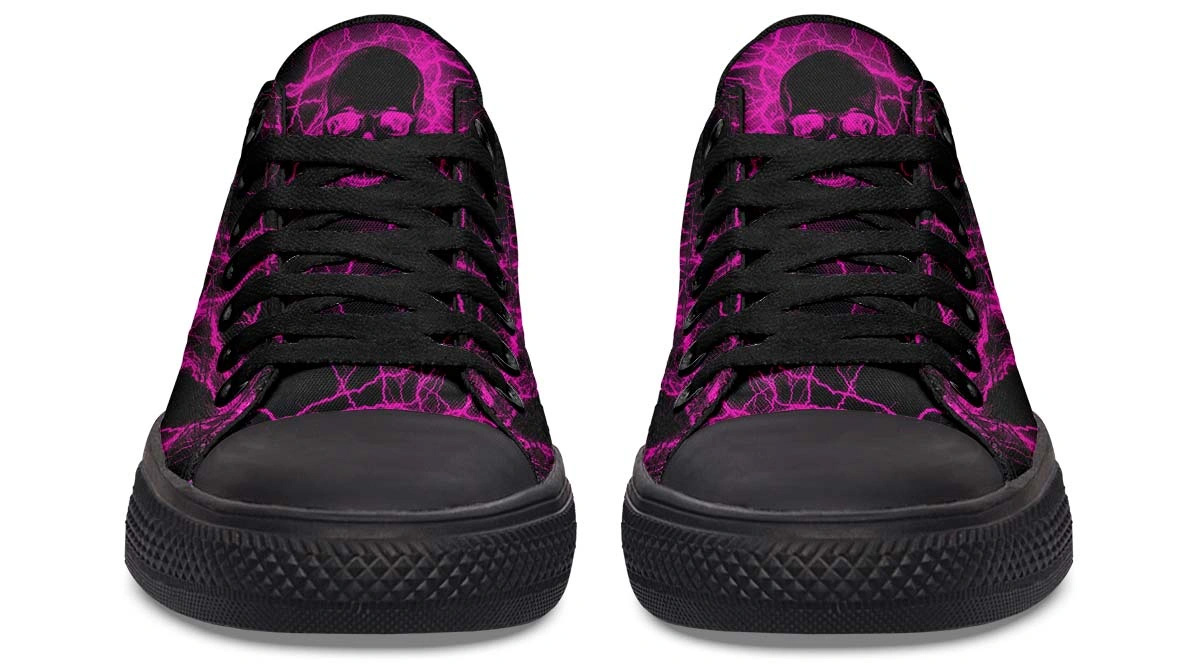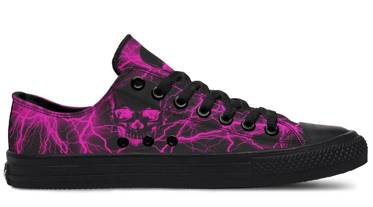 Make a statement with Pink Lightning Skull Low-Top Sneakers. Bold skull art meets vibrant pink accents in these stylish, comfortable streetwear essentials.